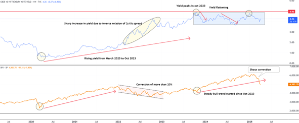 More recently, the S&P 500 Index’s sharp correction was preceded by a rise in yields to 4.6% in December 2024, driven by expectations that the Fed would maintain its policy stance amid a strong labour market and persistent inflation.