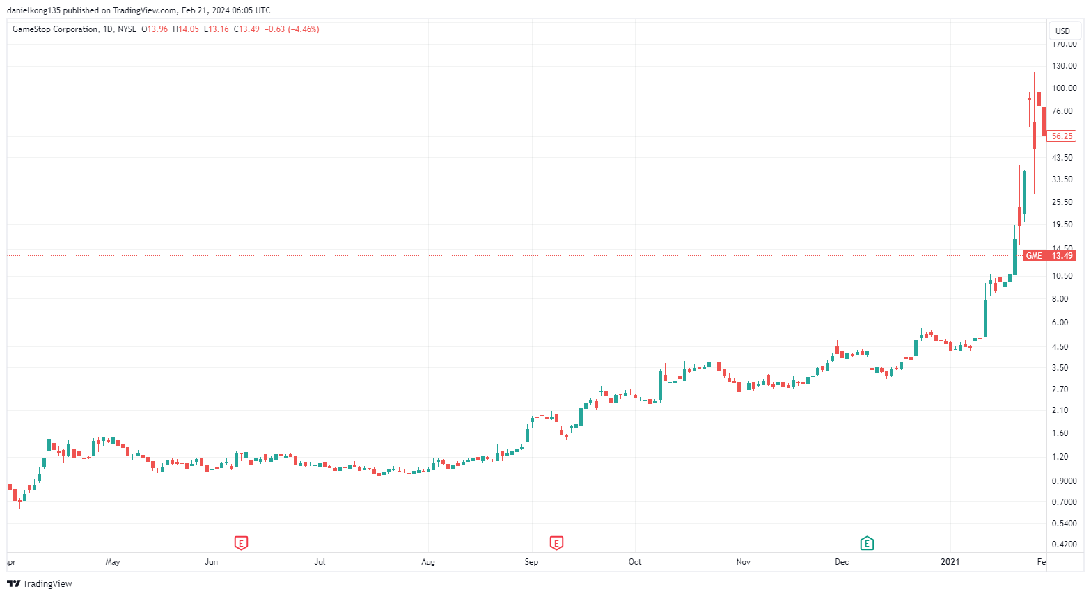 Chart 1: Gamestop stock price from April 2020 – January 2021. Price shown is after its stock split in July 2022. (https://www.tradingview.com/x/FeZP6Aay/