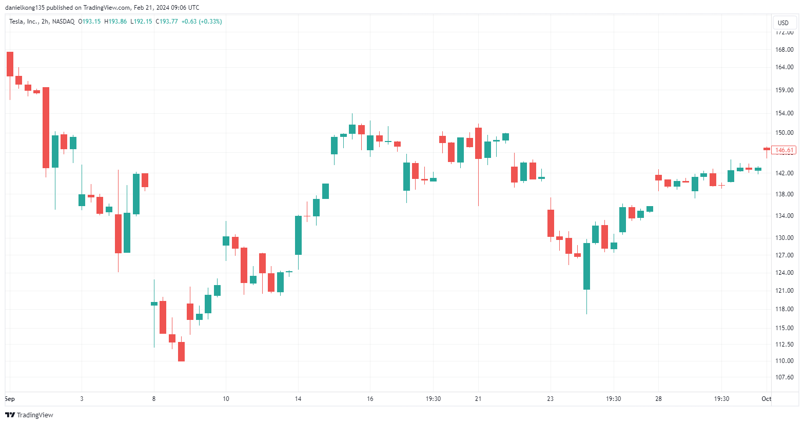 Chart 2: Tesla stock price for the month of September 2020. Price shown is after its stock split in August 2022.(https://www.tradingview.com/x/5tgfenKQ/