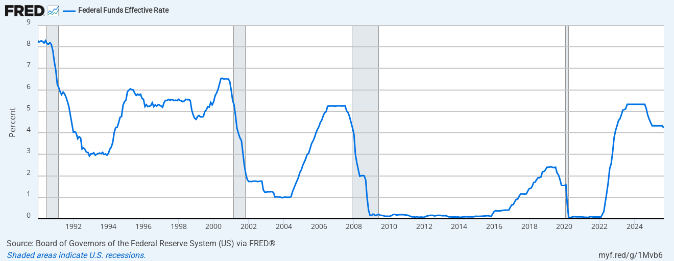 Image 1: Federal funds effective rate from 1990 to 2025. Source: https://fred.stlouisfed.org/graph/fredgraph.png?g=1Mvb6&height=490