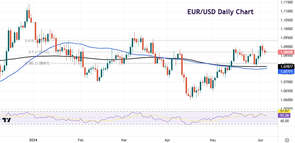 EUR closed modestly lower after solid final PMIs pointed to an improving growth outlook ahead. All eyes are on the ECB meeting today with a first rate cut baked in. “Cautious and gradual” is expected to be the bank’s approach going forward.