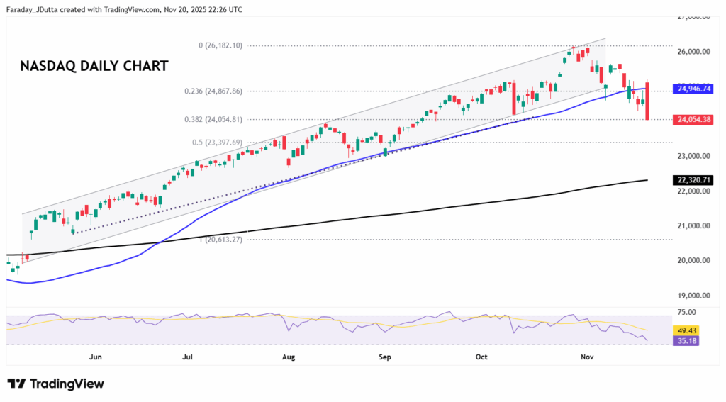 With Nvidia’s weighting around 10% in the tech-heavy Nasdaq, it’s no surprise that its earnings would have a huge influence on where the index goes, as we have stated previously. Prices have fallen close to 8% from the record high print at 28,182 from late October, and out of the bull channel seen since mid-May. This series of higher highs and higher lows was also supported by the 50-day SMA which has been broken recently. That currently sits at 24,946. Yesterday’s intraday price action looks bearish with the gap higher on the open quickly being filled and the index falling sharply. That has seen a big bearish engulfing candle print, with a major Fib retracement level (38.2%) of the May to October rally at 24,054. The midpoint of that move sits at 23,397.