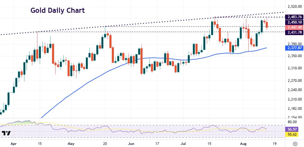 Gold fell back again after posting a high at $2479. Treasury yields were relatively quiet with the 10-year printing small doji candle and the dollar little changed.