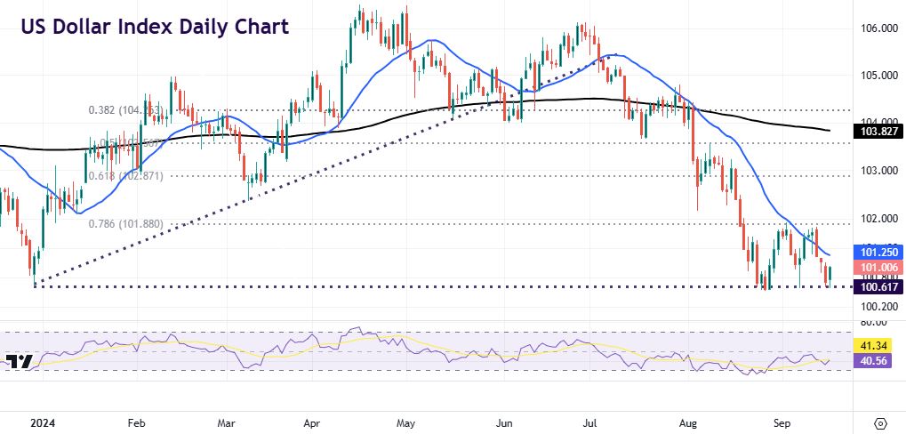 USD/JPY bounced off the long-term Fib retracement level (61.8%) of the 2023 low to 2024 high at 140.48. This comes after five straight down days last seen at the start of August. US yields consolidated around recent lows. The BoJ is expected keep rates steady at its Friday meeting, though Governor Ueda is likely to be relatively hawkish.