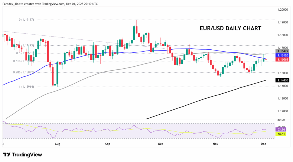 JPY was the big outperformer after hawkish comments from BoJ Governor Ueda saw the major drop to a low at 154.66 before paring losses. He stated that the BoJ would ‘consider the pros and cons of raising the policy rate’. But he also hinted that there is no clear opposition by new PM Sanae Takaichi to raising rates. This second factor had been crucial for markets, whose basic understanding was that Takaichi was a dovish-leaning influence. This year’s low to high move has a minor Fib level (78.6%) at 154.84. Rates have now priced in around 20bps of a rate hike at its meeting this month on December 19, up from 14bps.