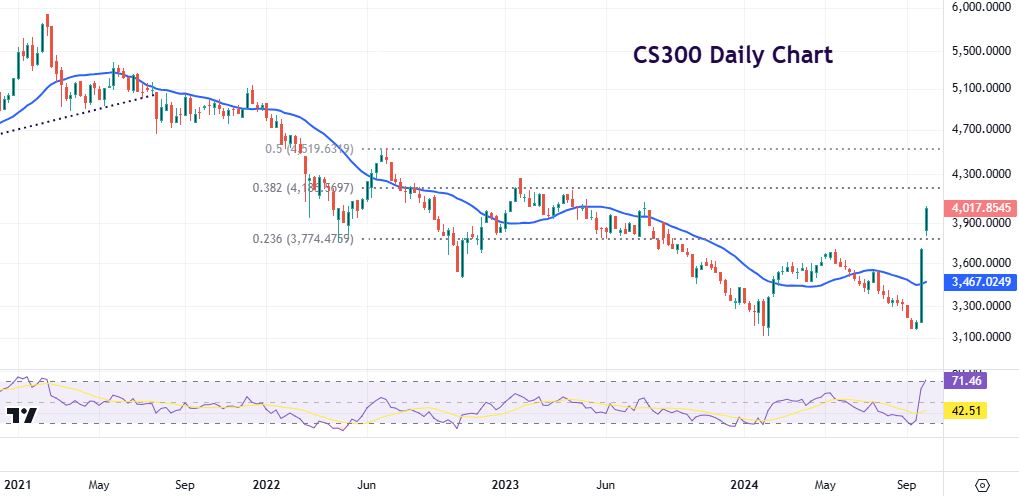 China’s top leaders dedicated their monthly meeting in the Politburo to the economy, which is normally not the case in September. This sent a clear signal that turning the economy around is now their number one priority. It is the biggest round of stimulus since the current crisis started three years ago and could turn out to be China’s ‘whatever-it-takes’ moment. Most economists are now seeing upside risks to growth estimate of sub-5% this year and next. The one-week National Holiday started on Tuesday with policy makers likely hoping for the measures to lift confidence when millions of families get together across China. The next major upside level is a retracement Fib (38.2%) of the 2021 to 2024 sell-off at 4,186. Support is the minor Fib (23.6%) at 3,774.