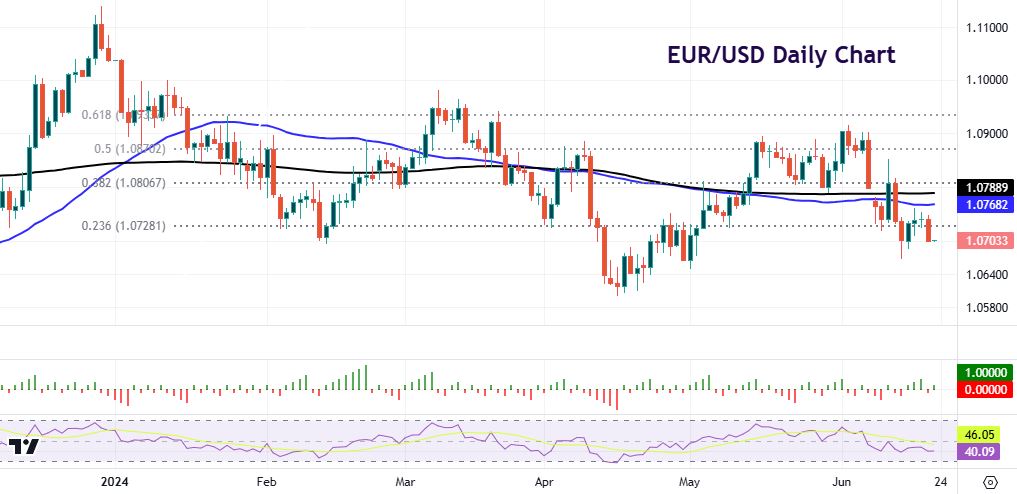 Until yesterday, Euro assets were having a better week after the French snap election announcement and political chaos caused sharp uncertainty in French markets. The spread between French and German 10-year government bonds spiked to 12-year highs, though that has eased modestly lower. The ECB remains on standby. Regarding monetary policy, with a follow-up rate cut in September only 60% priced in, a soft set of PMI numbers, or signs of a cooling off in inflation, would boost those odds, potentially weighing on the euro.