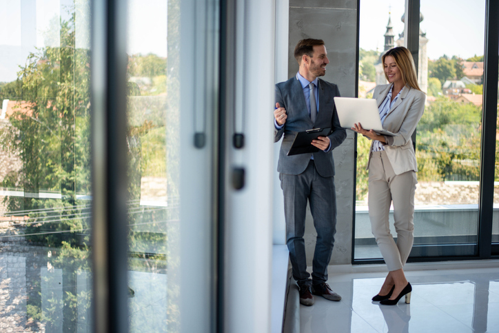 Business people using laptop in the office and talking