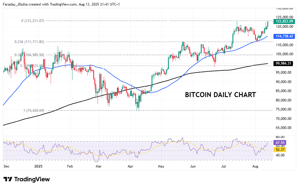 * Bitcoin and Ether close to fresh record highs above $122,000 and $4,700