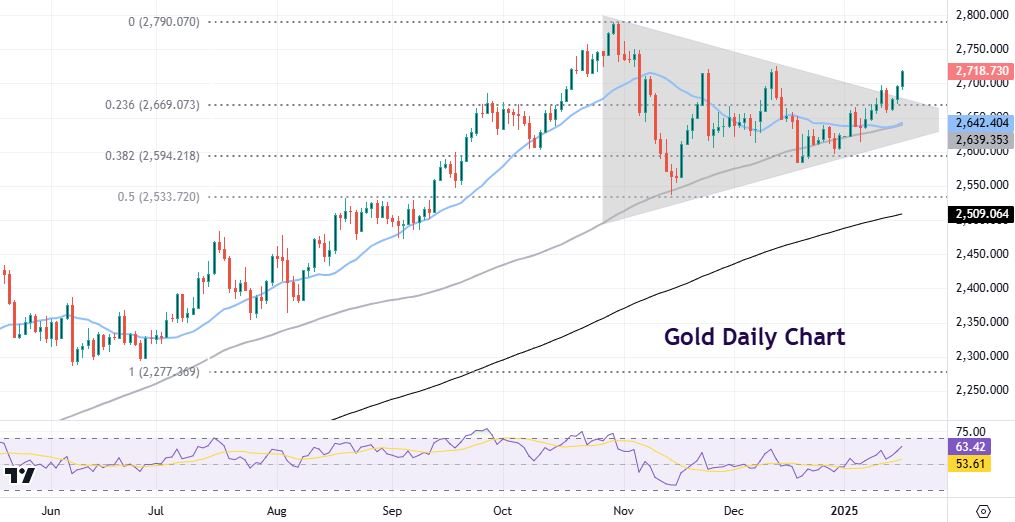 Of course, this helps non-yielding gold which is typically more attractive in a lower-rate environment. A bullish pennant looks to have formed after prices tracked sideways over the last few weeks. Key resistance now sits at the late November and mid-December highs around $2,720. A confirmed bullish breakout could see us then push up to record highs at $2,790. A false break will see bulls looking for support at $2,669 and $2,639/42.
