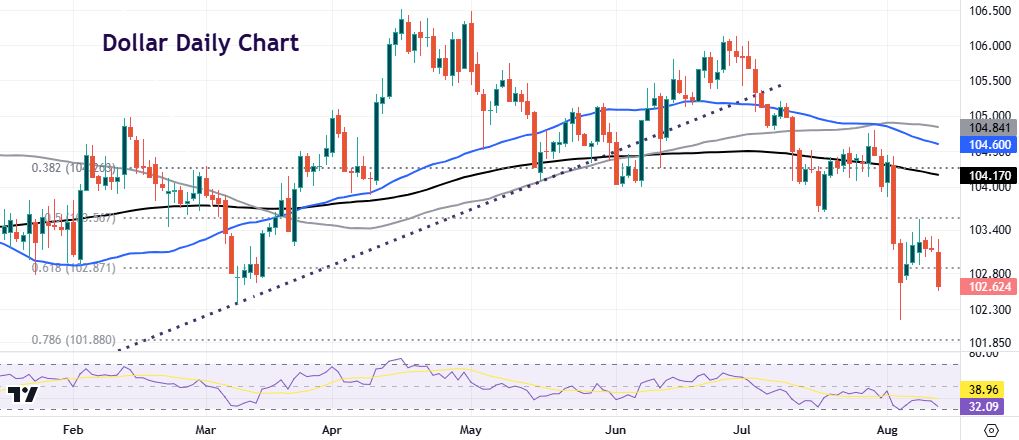 Markets could overreact to any inflation surprises due to low liquidity during the summer holidays. That is also true because ahead of the FOMC rate decision in September, money markets are torn between a 25bps or 50bps rate cut which is currently priced at just above a coin toss. A downside surprise could cement expectations for a 50bps Fed rate cut in September and an aggressive interest rate cutting cycle ahead. That could push the dollar index down nearer to its ‘Manic Monday’ low at 102.16.