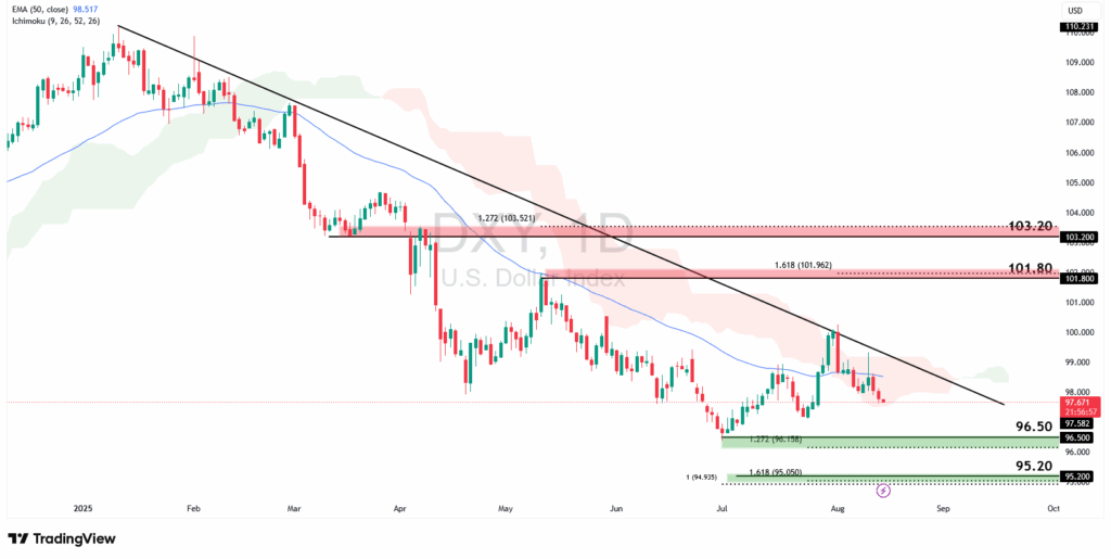 The dollar index remains under bearish pressure, trading below both the descending trendline resistance and the 50-EMA. A decisive break beneath the 96.50 swing-low support, aligned with the 127.2% Fibonacci retracement, would likely open the way toward the next support at 95.20, which coincides with the 161.8% retracement and 100% Fibonacci extension.
