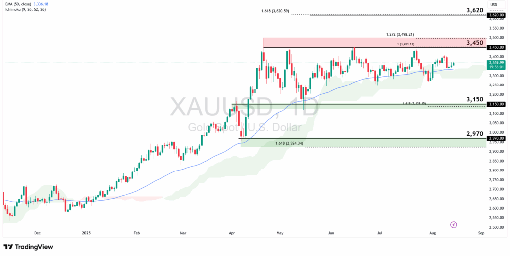 Gold remains above the 50-EMA, signalling that bullish sentiment is intact. Holding above the $3,150 support aligned with the 161.8% Fibonacci retracement would keep the upside bias in play, with the $3,450 swing-high resistance as the next key level, which coincides with the 100% Fibonacci extension and 127.2% retracement. A breakout above $3,450 could open the way toward $3,620, which is in line with the 161.8% retracement.