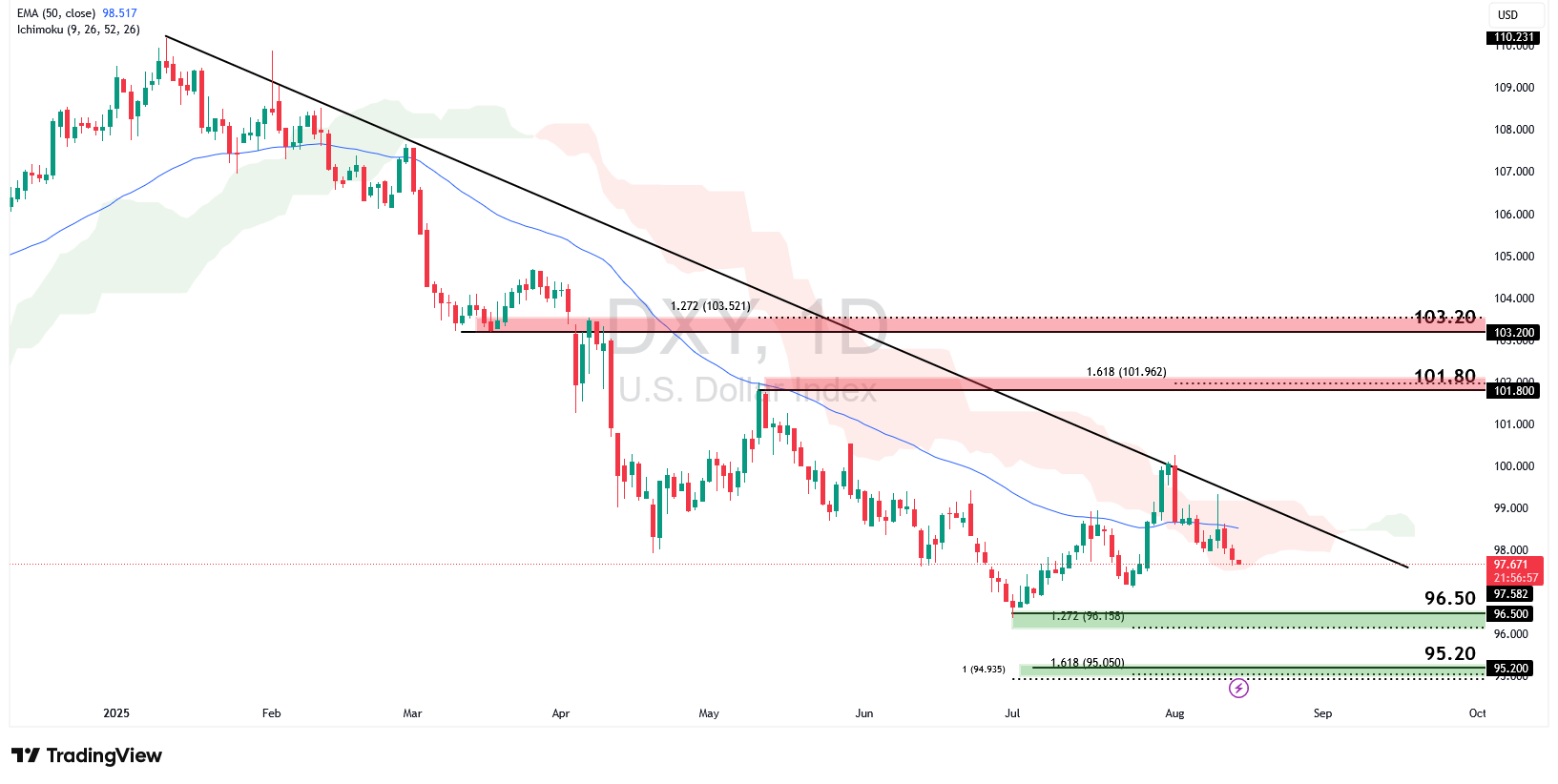 The dollar index remains under bearish pressure, trading below both the descending trendline resistance and the 50-EMA. A decisive break beneath the 96.50 swing-low support, aligned with the 127.2% Fibonacci retracement, would likely open the way toward the next support at 95.20, which coincides with the 161.8% retracement and 100% Fibonacci extension.