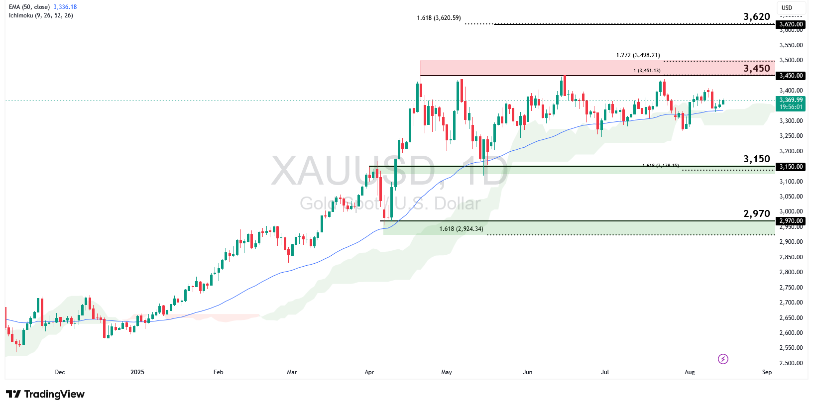 Gold remains above the 50-EMA, signalling that bullish sentiment is intact. Holding above the $3,150 support aligned with the 161.8% Fibonacci retracement would keep the upside bias in play, with the $3,450 swing-high resistance as the next key level, which coincides with the 100% Fibonacci extension and 127.2% retracement. A breakout above $3,450 could open the way toward $3,620, which is in line with the 161.8% retracement.