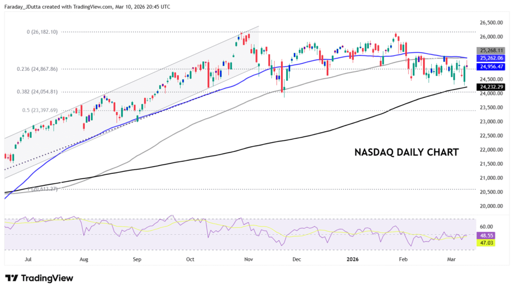 While stocks haven’t been hit as hard as many expected, US equities have outperformed European and Asian stocks in the past couple of weeks. Sector performance too has rotated again with energy-hungry industrials and material sectors falling after a great run, more than technology stocks. Notably too, defensive sectors like healthcare and staples did not get a boost from any haven flows. Instead, tech has taken the lead, and unlike HALO (heavy asset, low obselescence) companies, tech firms are typically immune to both commodity shocks and trade disruptions. The Nasdaq got close to the 200-day SMA at 24,233 before bouncing. Prices are back above a minor Fib level with the 50-day and 100-day SMAs above at 25,262/8.