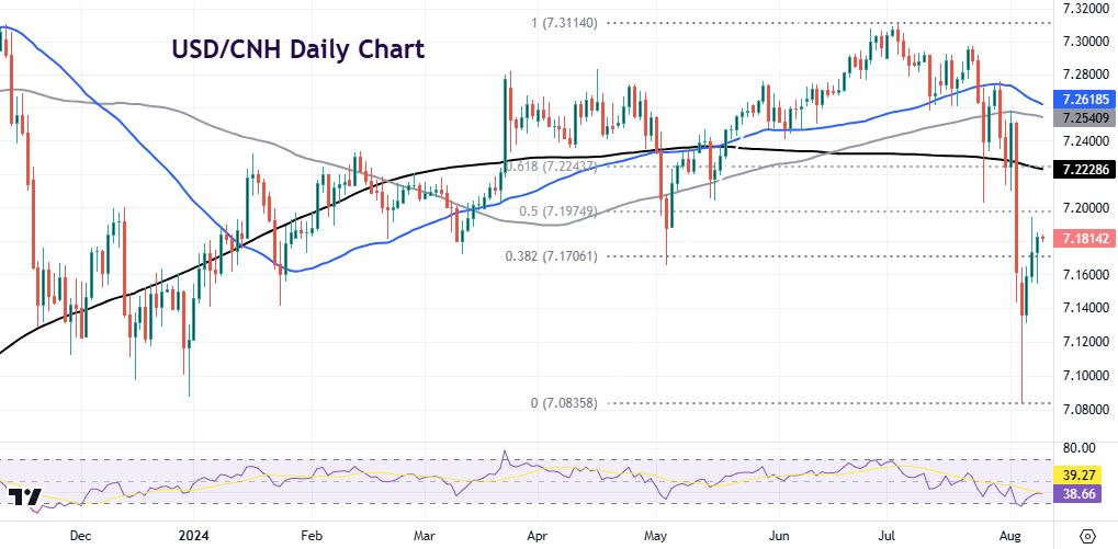 USD/CNH peaked above 7.30 early in July. Prices then collapsed after last Friday’s all-round softer than expected monthly US jobs data. That sharp move broke down through the 200-day SMA, now at 7.2228. Manic Monday’s spike lower took the pair to levels last seen at the end of last year. That strong support zone around 7.10 saw prices bounce back up to the 38.2% retracement level at 7.1730. The next upside target is 7.1974.