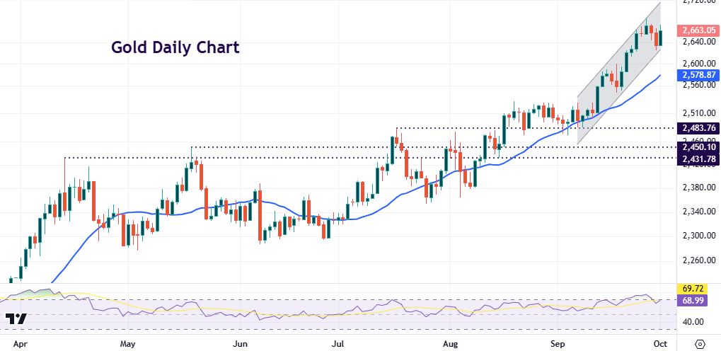 Speculators held their biggest long position in the precious metal since March 2020. Two-year US Treasury yields, which correlate closely with the Fed Funds rate, dropped to two-year lows. Lower borrowing costs are positive for gold as it doesn’t pay interest. Most recently, an ascending channel has developed and yesterday, the Middle East tensions saw more haven buying. Last week’s record high at $2685 is in sight and waiting to be conquered.