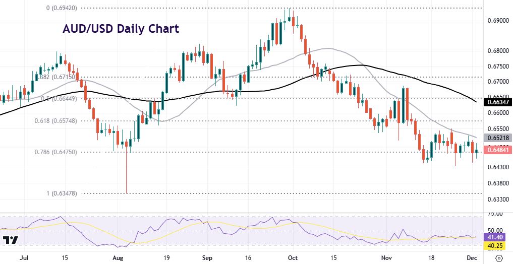 That means this is bearish consolidation before a breakdown through initial support around 0.6440 towards the August spike low at 0.6347. Alternatively, if US data especially starts to roll over, then a base around 0.6475 is in play. A move above the 21-day SMA at 0.6521 and the recent high at 0.6549 is needed to reverse the medium-term downtrend.