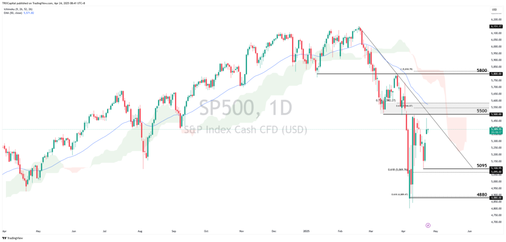 NAS100 continues holding below the descending trendline and Ichimoku cloud, indicating strong bearish pressure. A deeper pullback could see the price retest the 19,500 points resistance zone, aligning with the 78.6% Fibonacci Retracement and 61.8% Fibonacci Extension. If bearish momentum continues, the index may dip to the 16,500 points support, or further towards the next low at 15,300 points, in line with the 161.8% Fibonacci Extension. Otherwise, a deeper pullback in price, upon a break above the 19,500 points resistance could see a retest of the swing high at 20,300 points resistance again.