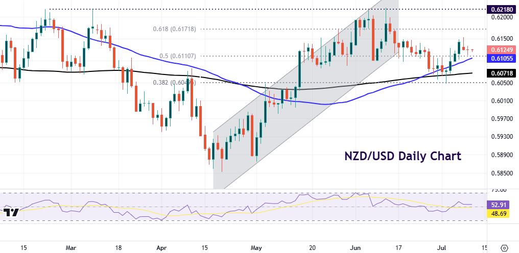The tone of the RBNZ will be key for the kiwi and price action. A hawkish hold was seen at the May meeting, but Governor Orr hasn’t been as hawkish with some of his recent commentary. Aside from the RBNZ, the US macro picture and Fed rate expectations will also direct the major, with NZD a pro-cyclical currency. China sentiment could also be important in the build-up to the US presidential election.