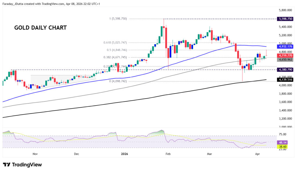 Gold rose to a high at $4,857 and near 4-week high before retracing back near to the day’s lows. Prices stayed above 100-day SMA at $4651. Treasury yields drove the mood as they reversed some of their losses through the day.