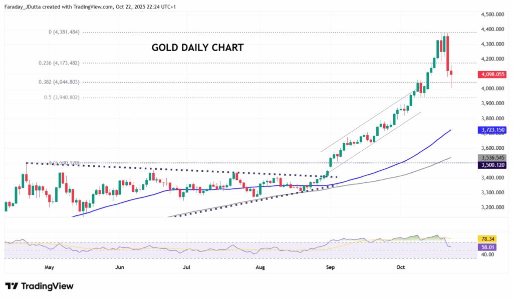 After suffering its worst single day in 12 years, and worst absolute fall on record, gold continued to remain volatile. Obviously, this comes after its stellar run with gains of 25% just in the last two months. The hugely overbought market was ripe for some profit taking with prices having gained as much as $1,000 since late August. The move higher in recent months has been mainly driven by ETF buying. Investors bought a record volume of gold ETFs last month, while the buying seen over the last month was the largest in terms of tonnage since March 2022. Central banks have continued to support bullion and inflation concerns are still present, while geopolitical tensions and dollar weakness are less compelling though hardly resolved. Prices dipped below a major Fib level (38.2%) of the September to October rally at $4,044. There’s a minor retracement level at $4,173 while the midpoint of that move sits at $3,940.