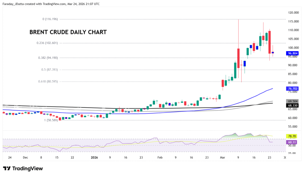 The International Energy Agency has described the current situation in the Middle East as the biggest oil supply disruption in history, highlighting the vulnerability of predicting any outlook, despite some of the latest headlines. Brent crude saw one of its sharpest intraday swings on record on Monday, after President Trump signalled the potential de‑escalation with Iran, triggering a sharp move lower in crude. Prices fell as much as 14% towards $92 following Trump’s comments, before recovering to trade near $102 after Iranian media reported there had been no direct communication with the US. Brent eventually closed under $100 for the first time since March 11. Trade was choppy yesterday on mixed messaging and headlines. A major Fib level (38.2%) of the December to March move sits at $94.19, with the minor retracement level at $102.60.