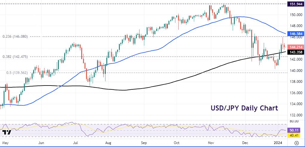 USD/JPY fell after spiking up to 145.97 on Friday immediately after the US employment report. The 200-day SMA sits at 143.29. Tokyo CPI data is released shortly.