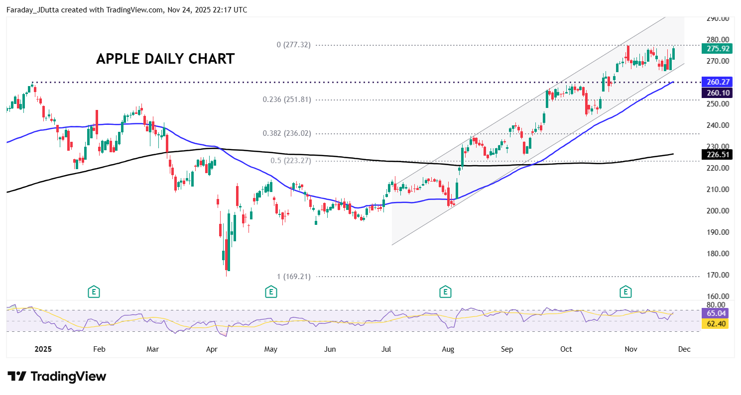 News that Apple was cutting thousands of jobs across its sales orgnaisation was a very rare layoff signal from the iPhone maker. Chartwise, prices have consolidated in recent weeks though price action has been strong over the last two days, having traded at the bottom of the recent range around $265 in the latter part of last week. The stock also touched the lower part of the bull channel seen since lows in the summer. Bulls have enjoyed the rebound off that support to the top end of the range, just below the record high at $277.32.  More bullish momentum could take the stocks to a fresh all-time top.