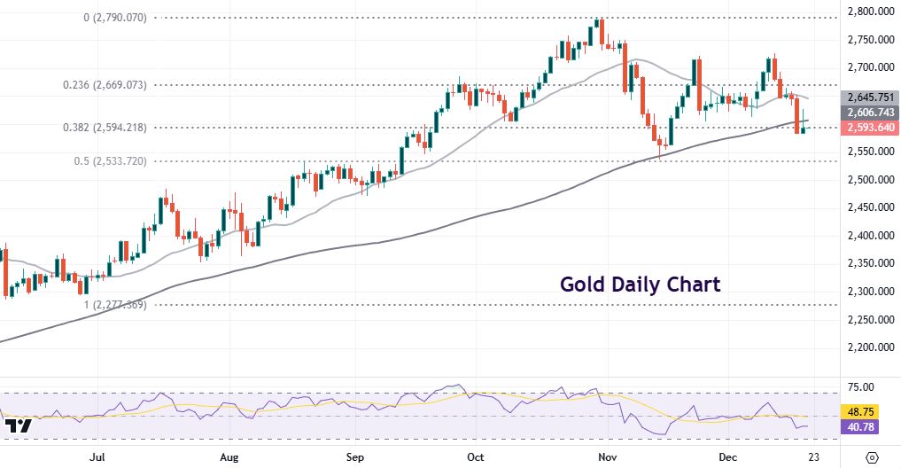 Prices have fallen to the Fib retracement (38.2%) of the May to October move higher at $2594. The 100-day SMA sits at $2606. The midpoint of that move tallies with the November low at $2536.