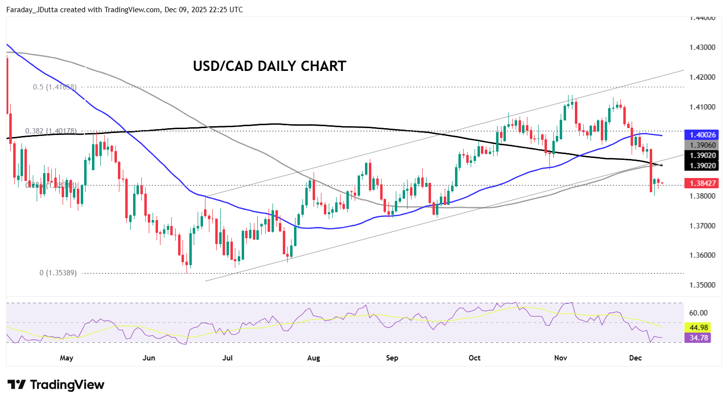 Policymakers at the Bank of Canada will very likely sit on their hands and keep the overnight rate at 2.25%, especially after the blowout November jobs data. Their rate decision comes a few hours before the Fed’s. With inflation easing and growth solid too, market expectations for more easing have faded. Indeed, the chances of a 2026 rate hike doubled to 40% after the recent labour market report. The bank is predicted to maintain that policy is appropriate while reiterating that it can respond if the outlook changes. There is no MPR but there will be a Macklem press conference.