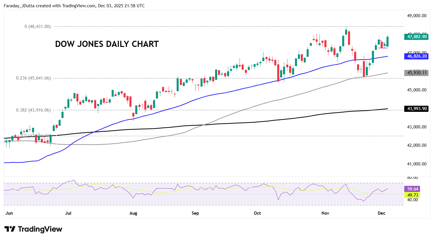 The Dow Jones sell-off in mid-November has nearly been erased, after prices hit the minor Fib retracement level (23.6%) of the April to November rally at 45,641. Also adding support was the 100-day SMA, now at 45,929. The bounce back has been solid with cyclicals and healthcare still strong and boosting the Dow, which is less tech weighted. Prices paused for breath in recent days, in another textbook bullish consolidation (flag) pattern. Today’s move to the upside looks to be pushing buyers up to the record top at 48.431. Support below the breakout level could come at the 50-day SMA at 46,824.
