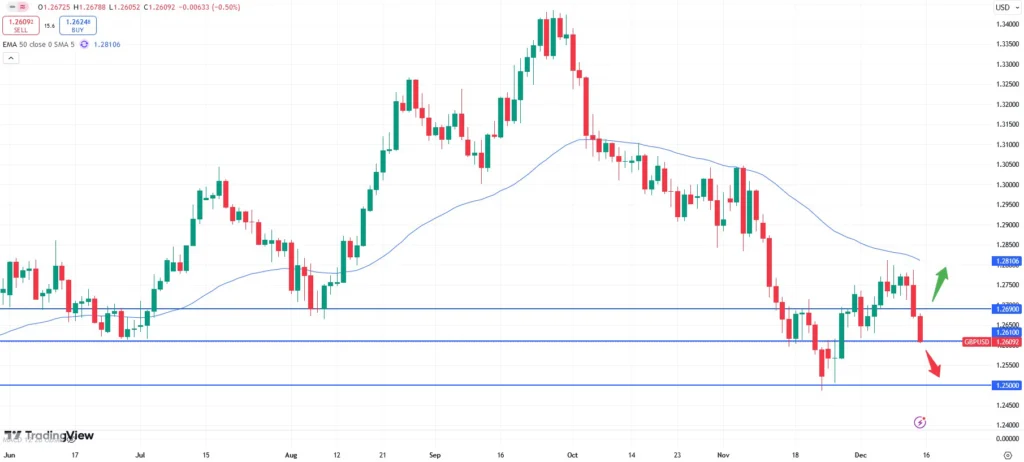 The EURUSD 4h chart shows that the recent falling trend has been broken to the upside. Especially a break of the 50- moving average trendline at about the 1.0518 area might hence open up room to the upside. Then, the market might be ready to test the 1.0580 resistance zone. On the other hand, traders might also be keen to use initial weakness of the Dollar to open up fresh long positions. The market might then resume the trend to the downside again. The interest rate decision will take place on Wednesday, 18 December at 20:00 CET.