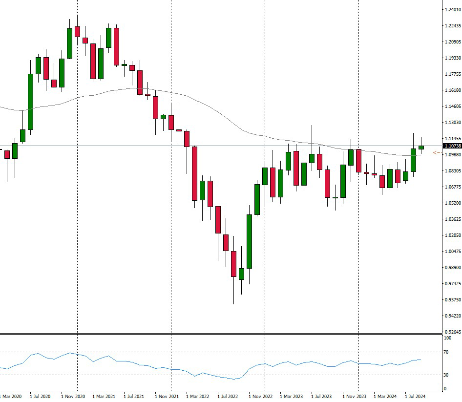 The EURUSD exchange rate was able to move positively again last week, while the Dollar came under pressure again. The trend in the monthly chart above signals possible further upward potential. The 50- moving average has already been breached here. The market is already trading above the psychological level of 1.1000. The interest rate decision will take place on Wednesday, 18 September at 20:00 CET.
