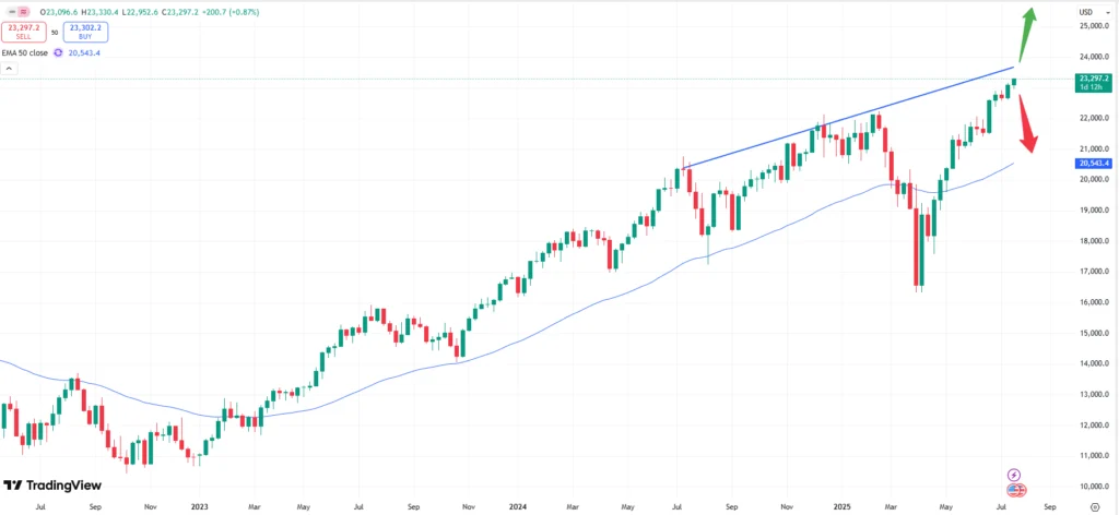 A closer look at the Nasdaq index reveals, that the market might still run higher towards the technical resistance trendline. Only then, some negative momentum might occur. A weaker reading of the news could spark another leg of rising prices, as the FED is expected to rather act soon. The data will be released on Friday, August 01 at 14:30 CET.