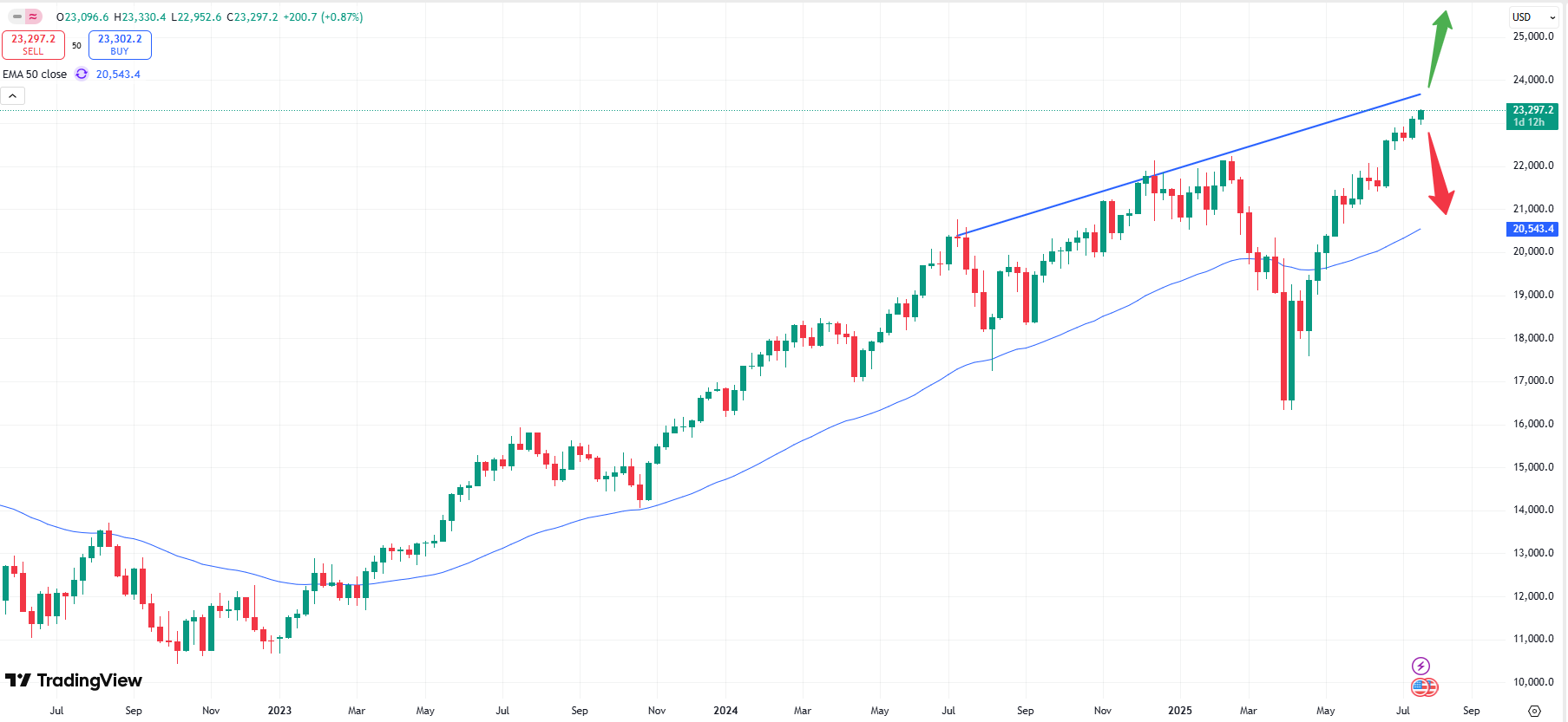 A closer look at the Nasdaq index reveals, that the market might still run higher towards the technical resistance trendline. Only then, some negative momentum might occur. A weaker reading of the news could spark another leg of rising prices, as the FED is expected to rather act soon. The data will be released on Friday, August 01 at 14:30 CET.