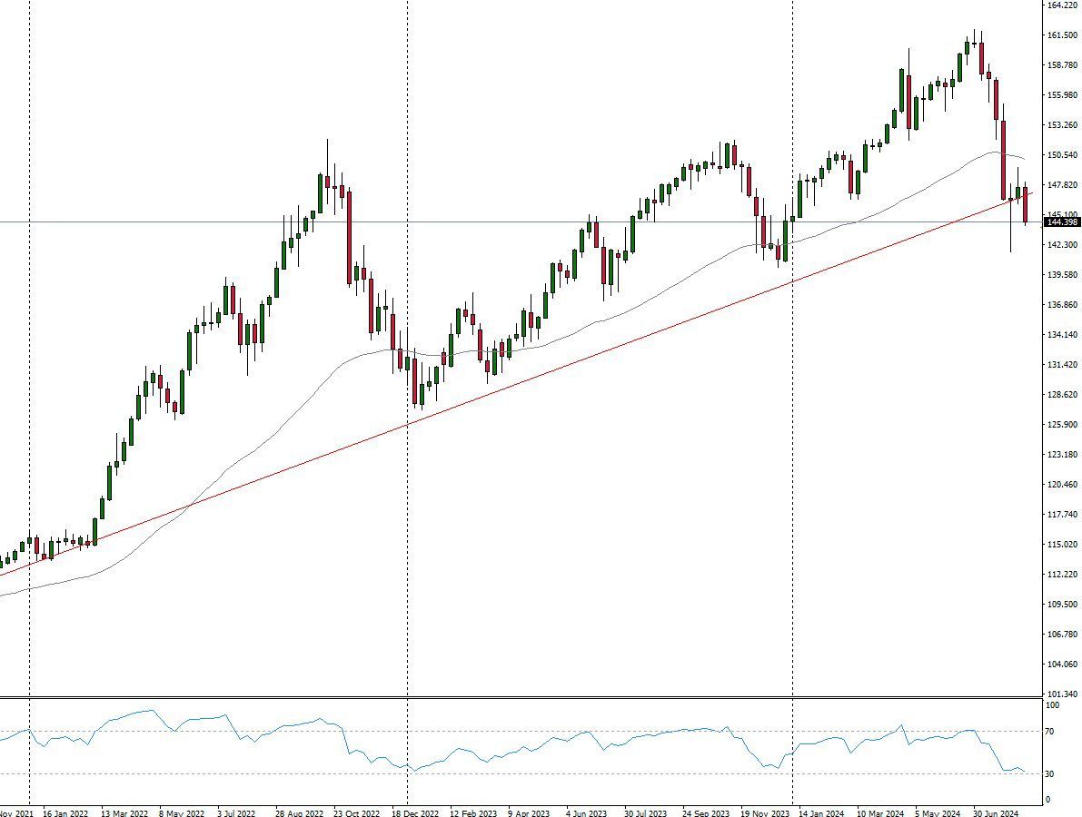 A look at the USDJPY currency pair shows that the market is currently at a crossroads. If the current downward trend is resumed, there could quickly be potential to move towards the USD 140.00 zone.
