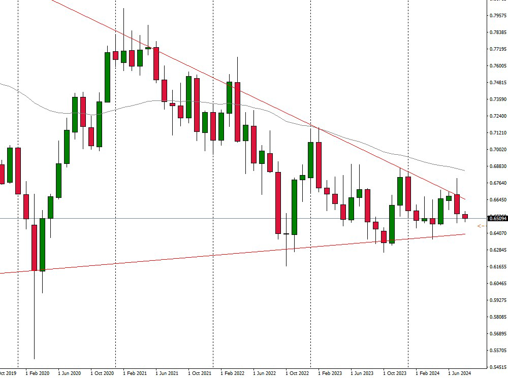 The Australian Dollar remains weak against most other currencies. Poor economic data from the US could lead to further losses. The Aussi is generally regarded as a “risk-on” currency, which is likely to fall as risk appetite declines. The monthly chart of the AUDUSD currency pair above shows this trend impressively. Further losses could therefore occur. The interest rate decision will take place on 06 August at 06:30 CET.