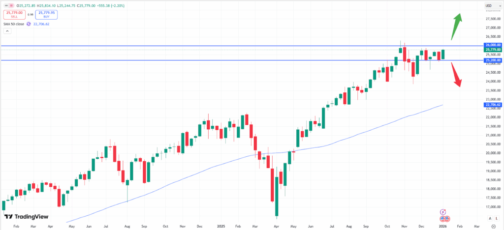 As the weekly chart above shows, the Nasdaq remains on track to push higher. Yet, since the market keeps lagging behind the S&P 500, a potential correction might be sharper in this market. Traders should hence pay attention to the support zone of 25.200 points. A break below might indicate that prices will proceed lower again. On the other hand, the positive momentum might also cause the market to break to the upside. A push beyond the technical resistance zone of 26.000 points might unleash a strong move higher. The data will be released on Tuesday, 13th of January at 14:30 CET.