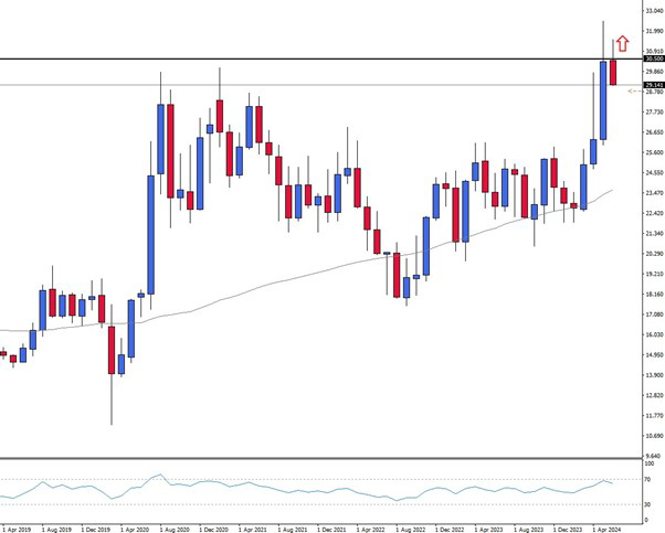 The price of Silver in particular could then attempt a new breakout to the upside, as signaled by the monthly chart. An entry could be USD 30.50. The data will be published on Wednesday, 12 June at 20:00 CET.