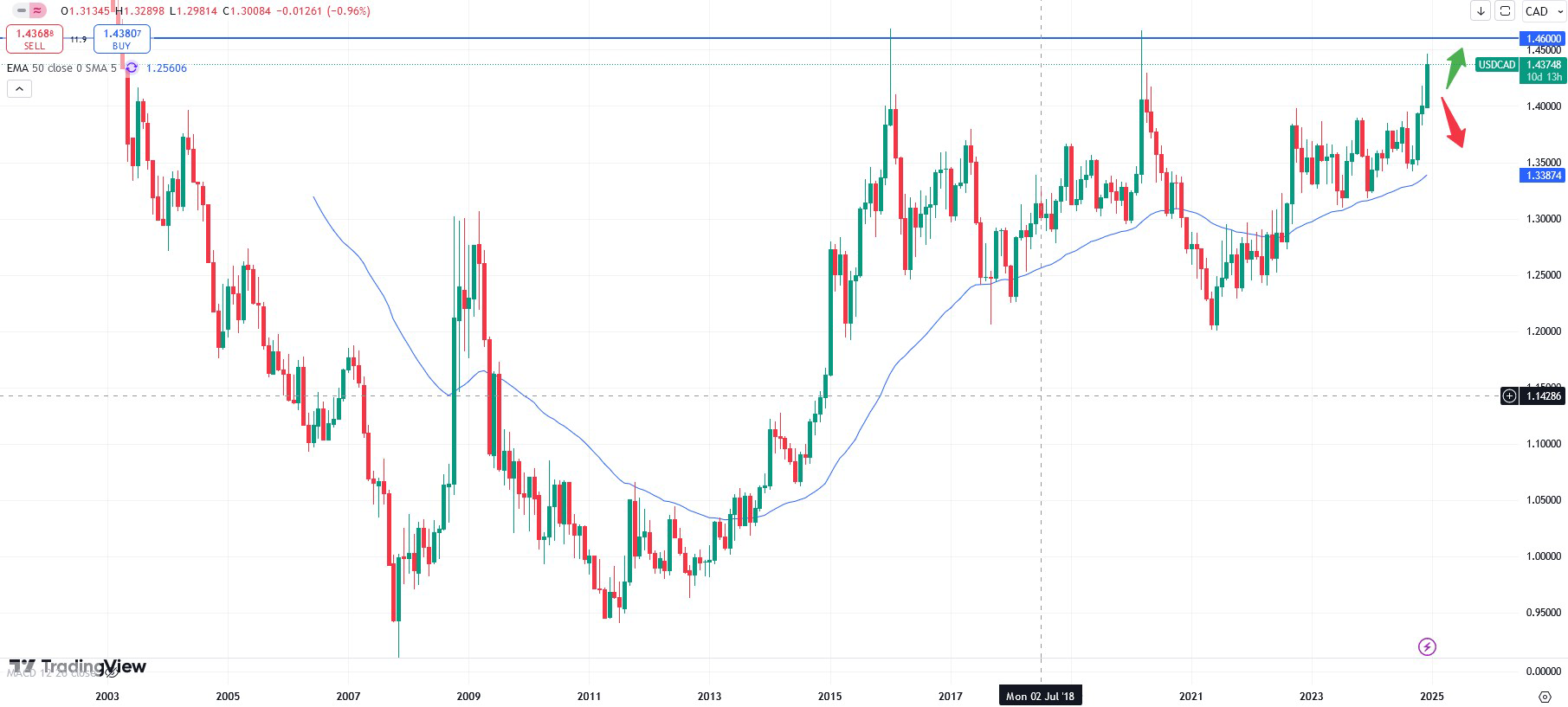 As the monthly chart above shows, the currency pair had moved towards the 1.4600 area, which marks a strong resistance zone. Should the market start a correction at that level, a triple- top might be formed indicating a push to lower levels. Furthermore, the push to the upside during most of 2024 could now come to an end as traders close their positions towards the end of the year. This could cause a retracement to the downside. The gross domestic product from Canada will be released on the 23rd December 23, 2024, at 14:30 CET.